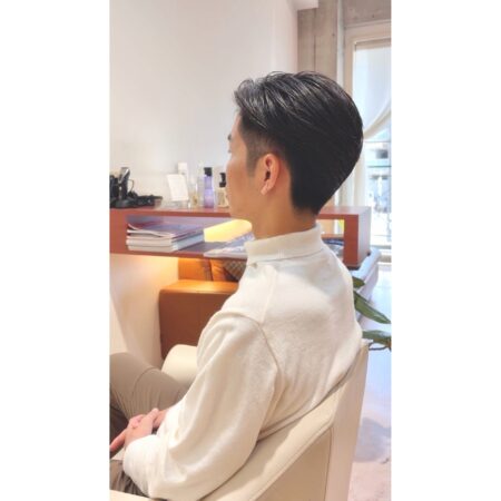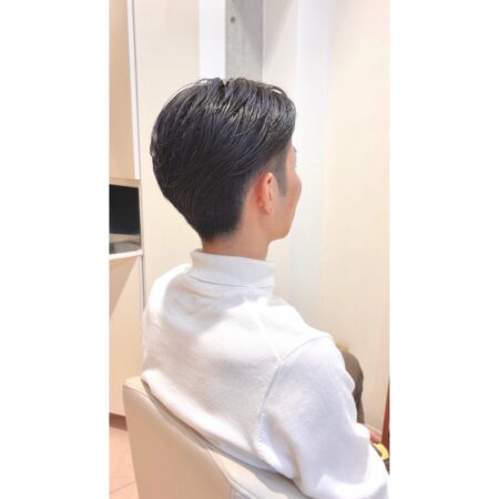 ツーブロックベースに刈り上げ、トップはパートをつけてオールバックに流したビジネスでもカジュアルでもいけるスタイルです!